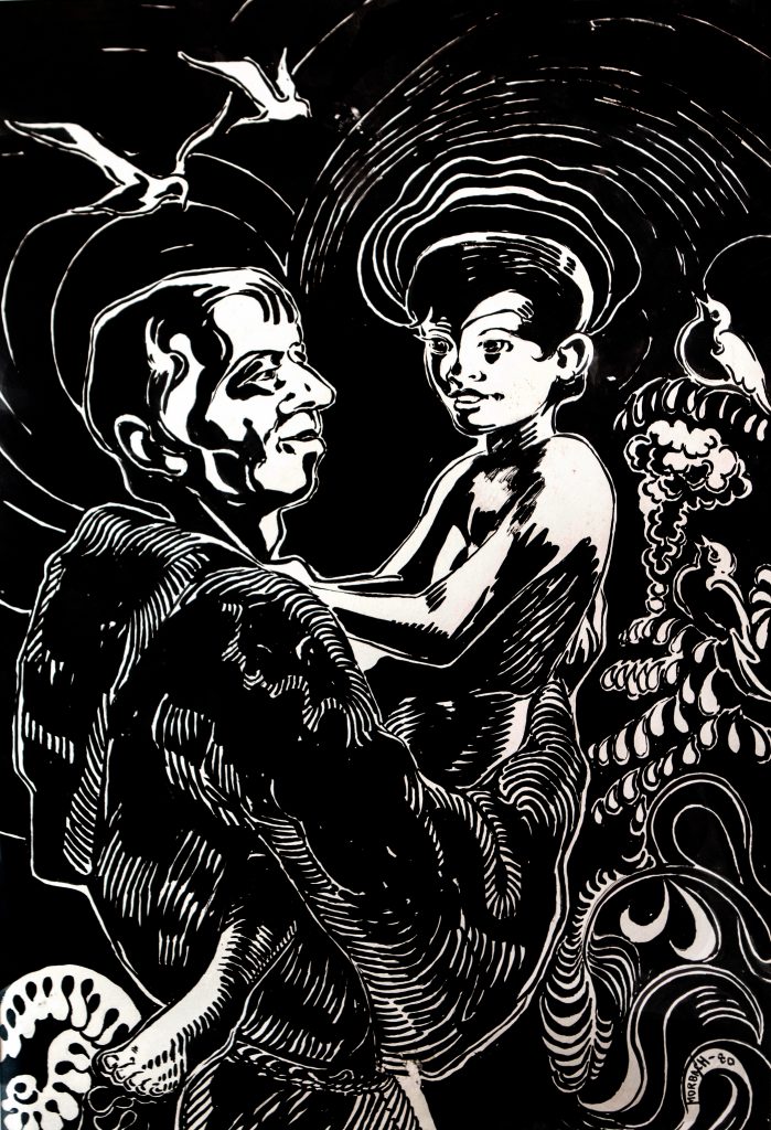 #paratodosverem Desenho produzido com a tinta Nanquim e a técnica do Bico-de-Pena nos tons preto e branco. Na obra São Francisco de Augusto Morbach vemos São Francisco de Assis segurando o menino Jesus em seus braços. Acima de suas cabeças há pássaros voando, no canto inferior direito há galhos e sob esses galhos há mais pássaros.