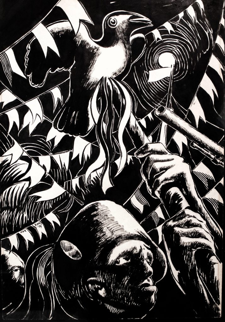 #paratodosverem Desenho produzido com a tinta Nanquim e a técnica do Bico-de-Pena nos tons preto e branco. Na obra Divino Espírito Santo de Augusto Morbach vemos na parte superior um pássaro de asas abertas. Ao seu redor bandeirinhas enfileiradas em barbantes. Na parte inferior vemos um homem que segura o mastro em que pousa o pássaro. Ele está olhando para o alto e usa um chapéu na cabeça. No canto inferior esquerdo vemos o rosto de um homem de lado, e na parte inferior direita vemos as mãos do homem e seus dedos segurando o mastro.