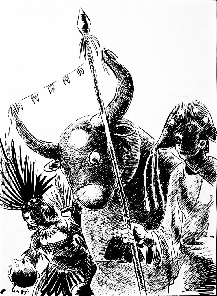 #paratodosverem Desenho produzido com a tinta Nanquim e a técnica do Bico-de-Pena nos tons preto e branco. Na obra Boi Bumbá de Pedro Morbach, vemos uma mulher no lado esquerdo com adereços no corpo e um cocar na cabeça. No centro vemos um boi com bandeirinhas enfileiradas entre os chifres, e no lado direito vemos um homem vestindo uma túnica e um chapéu de couro na cabeça segurando um bastão com a mão direita.