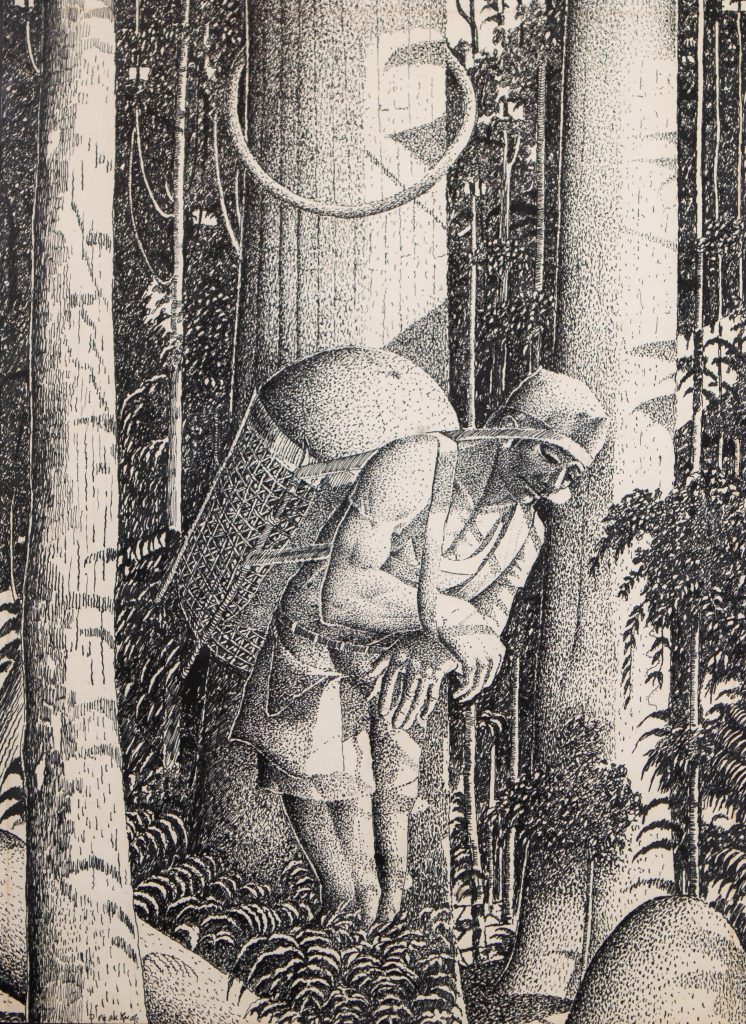 #paratodosverem Desenho produzido com a tinta nanquim e a técnica do bico-de-pena nos tons preto e branco. Na obra O castanheiro de Pedro Morbach vemos uma floresta com muitas árvores e ampla vegetação. Ao centro um homem que coleta castanha – do – Pará com o corpo inclinado para frente. Ao seu redor vemos três troncos de árvores. Ele carrega um cesto pendurado pela testa e pelas mãos cruzadas, e apoiado em suas costas. Na parte inferior vemos plantas e rochas próximo ao solo.