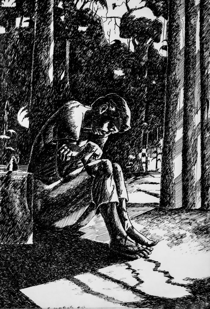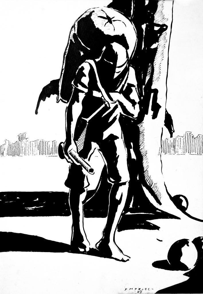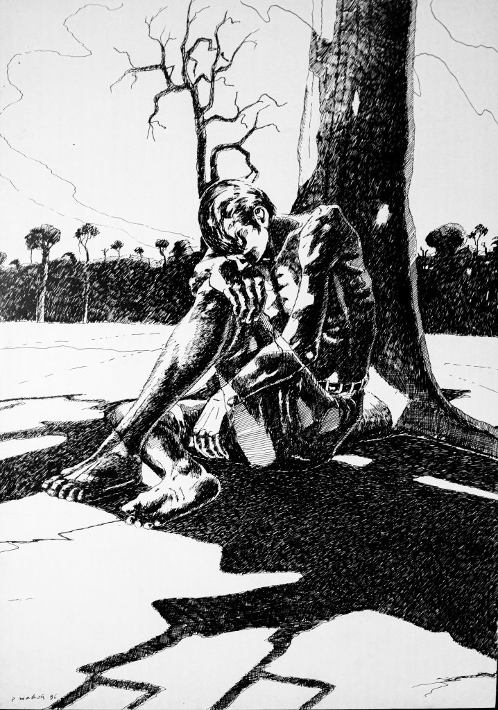 #paratodosverem Desenho produzido com a tinta Nanquim e a técnica do Bico – de – Pena nos tons preto e branco. Na obra O triste posseiro de Pedro Morbach vemos um terreno desmatado dentro da floresta e os galhos de uma árvore. Ao fundo, uma paisagem com copas de árvores, e no centro um homem sem camisa sentado ao chão encostado em um tronco de uma árvore. Seu rosto é triste e seu corpo é magro. O homem está descalço com a cabeça apoiada sobre a mão e joelho direito. O outro braço está apoiado sobre a coxa esquerda, e sua mão está pendurada sem atingir o chão. Na parte inferior vemos a sombra do homem e da árvore.