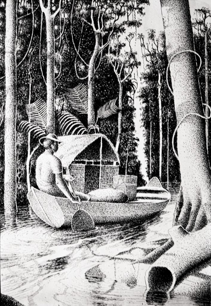 #paratodosverem Desenho produzido com a tinta Nanquim e a técnica do Bico- de – Pena nos tons preto e branco. Na obra O pescador de Pedro Morbach vemos uma floresta com muitas árvores, folhas de palmeiras e uma casa feita de palha na margem do rio. Ao centro, um pescador sentado dentro de uma canoa usando um chapéu. Ele segura um remo para navegar e dentro da canoa vemos um cesto e um saco. Na parte inferior vemos as águas do rio em movimento ao redor do barco.