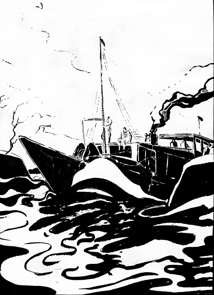 #paratodosverem Desenho produzido com a tinta Nanquim e a técnica do Bico- de – Pena nos tons preto e branco. Na obra Descendo o rio de Pedro Morbach vemos ao centro uma embarcação a vapor. Na parte superior direita a fumaça saindo pela chaminé. À esquerda vemos pessoas dentro do barco. Ao centro próximo ao mastro um homem sentado acima da cabine, e à esquerda um homem em pé apoiado no mastro. Na parte inferior vemos linhas circulares e onduladas que formam os movimentos do rio ao redor do barco.