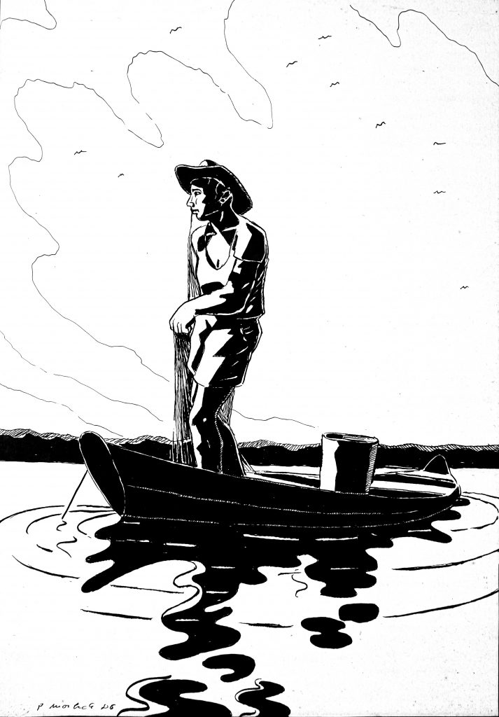 #paratodosverem Desenho produzido com a tinta Nanquim e a técnica do bico de pena nos tons preto e branco. Na obra Pescando com tarrafa de Pedro Morbach vemos na parte superior nuvens e pássaros no céu. Ao centro um homem em pé dentro de uma canoa de pequeno porte. Ele veste camisa, short e chapéu na cabeça e segura uma tarrafa nas mãos. Ao fundo da canoa vemos a margem do rio. Dentro da canoa há um balde, e na parte inferior vemos linhas circulares e onduladas formando os movimentos da água ao redor da canoa.