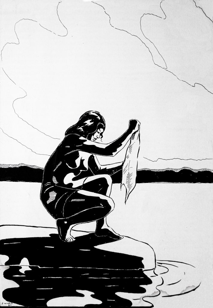 #paratodosverem Desenho produzido com a tinta Nanquim e a técnica do Bico-de-Pena nos tons preto e branco. Na obra A lavadeira de Pedro Morbach vemos na parte superior nuvens no céu. No centro vemos uma mulher agachada sobre uma rocha segurando um tecido. Ela tem cabelos soltos, usa um vestido e está descalça. Ao fundo vemos a margem do rio formada por uma vegetação. Na parte inferior ao redor da pedra em que a mulher está lavando roupa vemos linhas circulares e onduladas formando os movimentos da água.