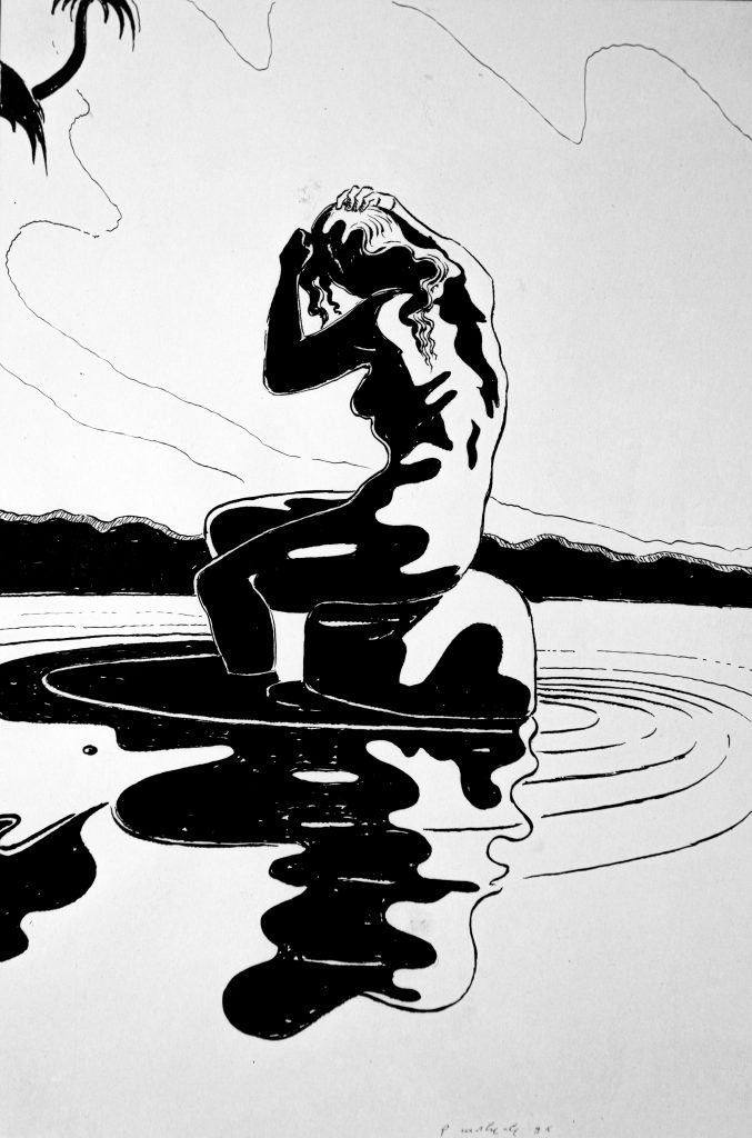 #paratodosverem Desenho produzido com a tinta Nanquim e a técnica do Bico-de-Pena nos tons preto e branco. Na obra A namorada do boto de Pedro Morbach vemos ao lado superior esquerdo um galho com folhas de árvores. Na parte superior nuvens no céu. No centro vemos uma mulher nua de costas, passando as mãos nos cabelos soltos, sentada em uma rocha dentro do rio e ao fundo a margem do rio formada por uma vegetação. Na parte inferior ao redor da pedra em que a mulher está sentada vemos linhas circulares e onduladas formando os movimentos da água.