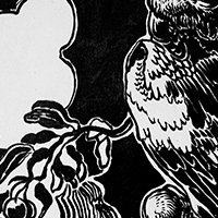 #paratodosverem Desenho produzido com a tinta Nanquim e a técnica do Bico-de-pena nos tons preto e branco. Na obra Arara de Augusto Morbach vemos no centro do quadro uma Arara com o olhar voltado para trás. Ela pousa sob o galho de uma árvore e está rodeada de frutos e folhas.